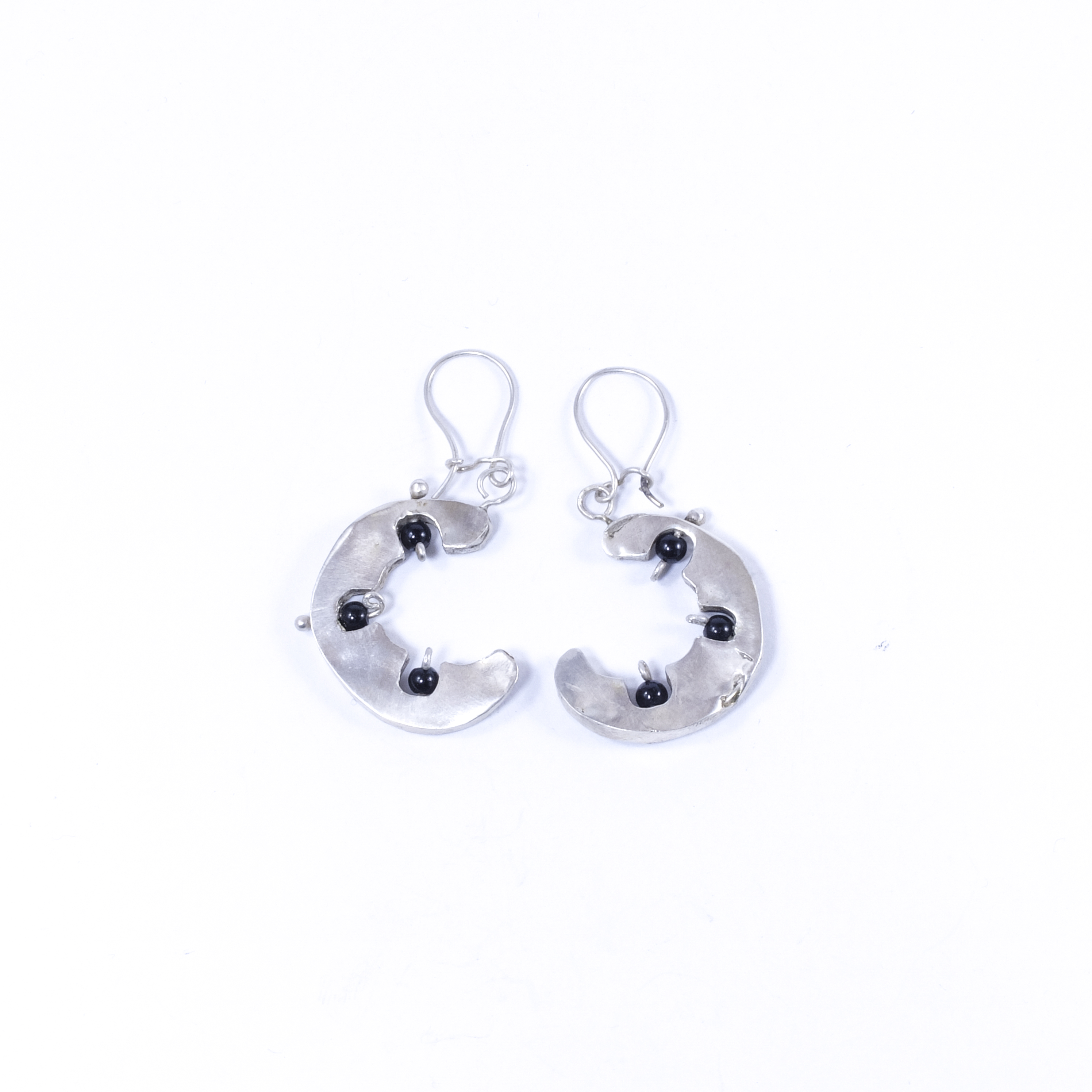 Improvised with silver tube and black onyx beads in a hollow crescent, these earrings are an expression of the forming of new life.