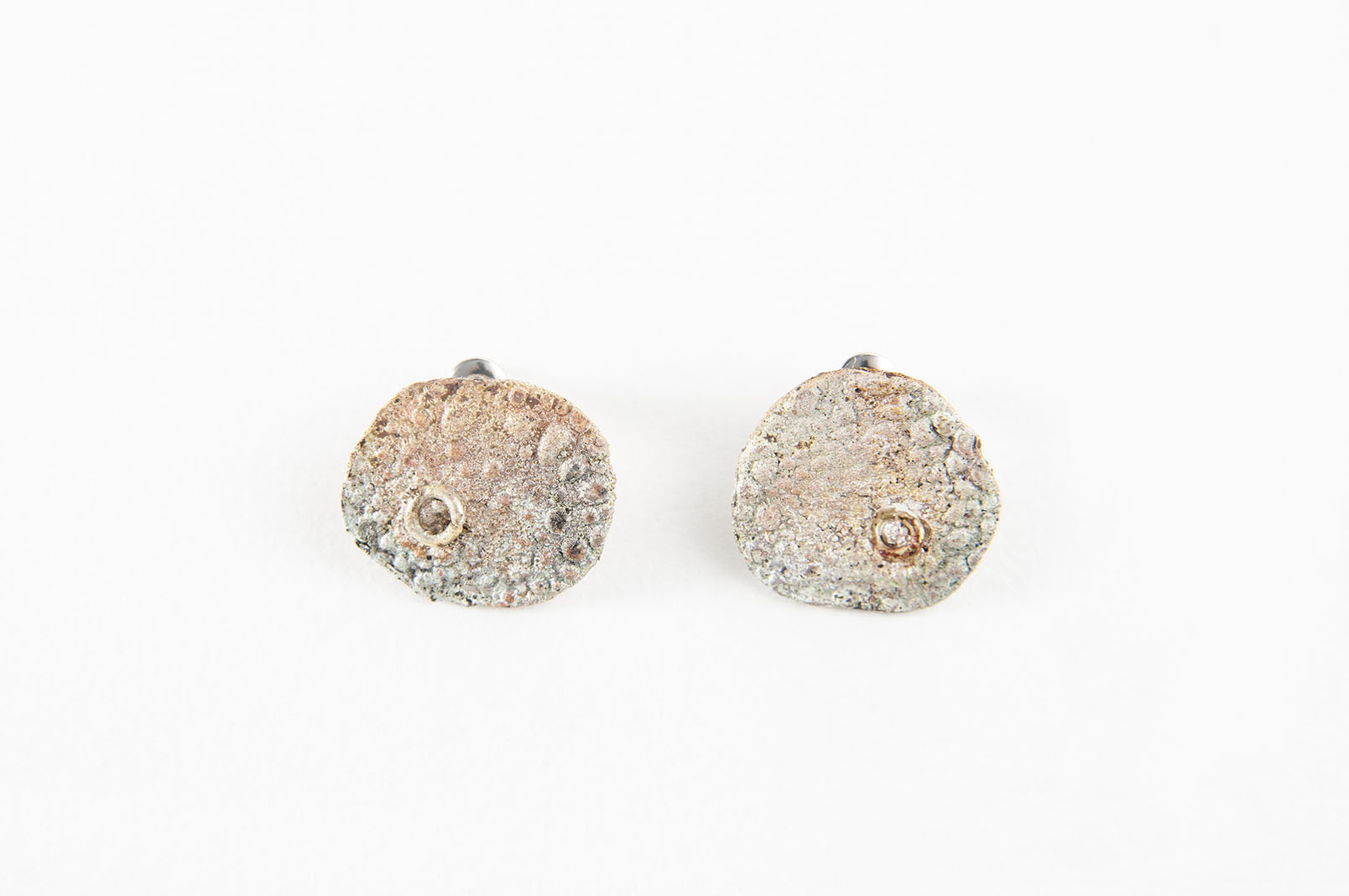Flat and round silver plate textured with fire and fused with a brass circlet makes a primitive and organic design. Inspired by the ancient and alive technique of pouring lead.